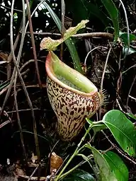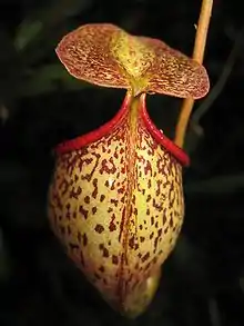 Rosette and lower pitchers are only produced briefly before the plant starts to climb. They are either entirely ovate or only ovate in the upper half and infundibular below. They often narrow just below the peristome. Terrestrial pitchers grow to 10 cm in height by 6 cm in width. A pair of fringed wings (≤10 mm wide) usually runs down the ventral surface of the trap, bearing filaments up to 8 mm long, although these wings may be absent altogether or only extend for a portion of the trap's length.[9] The pitcher mouth is round and positioned horizontally in the front two-thirds, rising at the rear to form a short neck.[8] The peristome is flattened, strongly incurved, and measures up to 15 mm in width. It bears ribs up to 0.8 mm high and spaced up to 1 mm apart. These ribs terminate in distinct teeth (≤3 mm long) on the inner margin of the peristome.[9] The inner portion of the peristome accounts for around 78% of its total cross-sectional surface length.[15] The peristome forms a short neck at the rear, where the teeth form two parallel rows. The inner surface is wholly glandular;[8] there is no waxy zone.[15] The pitcher lid or operculum is ovate to elliptic and has a cordate base. It measures up to 6 cm in length by 5 cm in width. It bears no appendages on its lower surface. A flattened spur measuring up to 5 mm in length is inserted near the base of the lid. It may or may not be branched. Lower pitchers are typically light yellow to olive green and speckled with red or purple. The inner surface is a light shade of yellow. The peristome is generally yellow or orange in freshly opened traps, later becoming dark red to purple as the pitcher matures. The upper surface of the lid is often yellow with orange to purple blotches, whereas the underside may be completely red, although this is not always the case.[9]