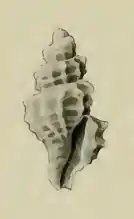 Sculpture:—On the body whorl there are four, and on the earlier two, spiral cords, the topmost running along the angle of the shell. The radials which over-ride these are thin elevated lamellae, commencing at the suture and ending as imbricating scales on the snout. There are sixteen on the body whorl. The outer lip is simple. The sinus is short and subsutural. The siphonal canal is short. [2]