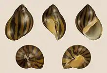 Native to brackish tidal waters such as mangrove swamps, this snail is also classified as Vittina turrita,[4] and is sold in the freshwater aquarium trade under the common name "tiger nerite" or "tiger snail."[5] Adults may thrive in fresh water with sufficient dissolved minerals. The species has separate male and female individuals; females lay eggs, which hatch into larvae that can survive only in brackish water. Adults grow to about 2.5 cm, and show a pale tan body with a darker tan shell, sometimes brownish or reddish, marked by black bands of varied width. The head has two short antennae which protrude from beneath the shell, each with a small eye at the base (generally invisible benath the shell). Nerites are slow-moving snails that travel over rocks or hard substrates and do not burrow. Like other members of its genus, the species grazes on algae which it rasps from surfaces with its radula. It may opportunistically feed on other debris, but does not pursue animal food.[6] Because a variety of common names including "zebra nerite" can be used to refer to both species, it is sometimes confused with Neritina natalensis.