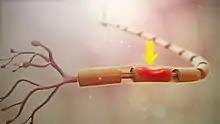 Nerve injury is injury to nervous tissue. There is no single classification system that can describe all the many variations of nerve injury. In 1941, Seddon introduced a classification of nerve injuries based on three main types of nerve fiber injury and whether there is continuity of the nerve.[1] Usually, however, (peripheral) nerve injury is classified in five stages, based on the extent of damage to both the nerve and the surrounding connective tissue, since supporting glial cells may be involved. Unlike in the central nervous system, neuroregeneration in the peripheral nervous system is possible.[2][3] The processes that occur in peripheral regeneration can be divided into the following major events: Wallerian degeneration, axon regeneration/growth, and nerve reinnervation. The events that occur in peripheral regeneration occur with respect to the axis of the nerve injury. The proximal stump refers to the end of the injured neuron that is still attached to the neuron cell body; it is the part that regenerates. The distal stump refers to the end of the injured neuron that is still attached to the end of the axon; it is the part of the neuron that will degenerate but that remains in the area toward which the regenerating axon grows. The study of peripheral nerve injury began during the American Civil War and has greatly expanded to the point of using growth-promoting molecules.[4]
