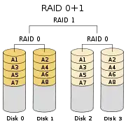 RAID 01, also called RAID 0+1, is a RAID level using a mirror of stripes, achieving both replication and sharing of data between disks.[3] The usable capacity of a RAID 01 array is the same as in a RAID 1 array made of the same drives, in which one half of the drives is used to mirror the other half. , where is the total number of drives and is the capacity of the smallest drive in the array.[4]