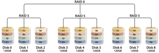 RAID 50, also called RAID 5+0, combines the straight block-level striping of RAID 0 with the distributed parity of RAID 5.[3] As a RAID 0 array striped across RAID 5 elements, minimal RAID 50 configuration requires six drives. On the right is an example where three collections of 120 GB RAID 5s are striped together to make 720 GB of total storage space.