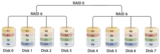 RAID 60, also called RAID 6+0, combines the straight block-level striping of RAID 0 with the distributed double parity of RAID 6, resulting in a RAID 0 array striped across RAID 6 elements. It requires at least eight disks.[14]