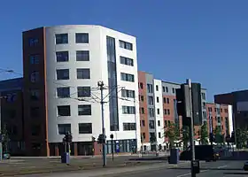 One of the most significant contemporary developments in Netherthorpe has been the creation of the Sheffield Supertram light rail transport system in 1995 which has given the suburb excellent transport links as it stands on both the blue and yellow routes. The suburb has its own station on Netherthorpe Road which is on the central reservation of the dual carriageway and access is by a subway, which is limited by chicane barriers. A signed cycle route passes through the underpass, though the barriers prevent this being used by cycles or mobility aids which are not able to negotiate the barriers. Netherthorpe's close proximity to Sheffield University has always meant that the suburb has had a large concentration of students living within it. In 2009, the Opal 3 complex was built on Hoyle Street with accommodation for 992 students with leisure facilities and disabled access.[10] Located within Opel 3 is the English Language Teaching Centre which is part of Sheffield University and helps students who are having problems with the English language.[11]