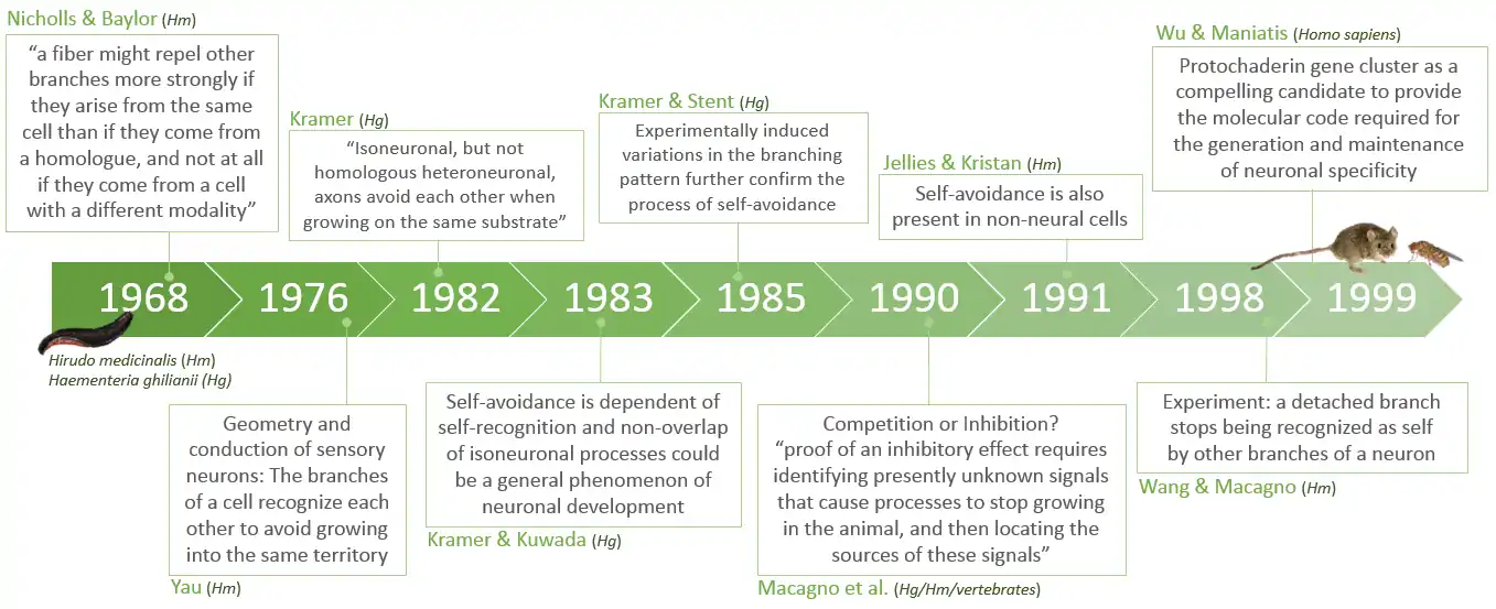The concept of neuronal self-avoidance emerged about 50 years ago. The pioneer studies were performed in the leech, focusing on the central nervous system and developing mechanosensory neurons. Leeches from two species: Hirudo medicinalis and Haementeria ghilianii, remained the main organism for the study of the question of neuronal self-recognition and self-avoidance. In this animal, the repeating segmental pattern of the nervous system along with the fact that neurons are relatively few in number, and many are large enough to be recognized[12] allowed the experimental study of the general problem of neuronal specificity. In 1968, through the mapping of mechanoreceptor axonal receptive fields in H. medicilalis, Nicholls and Baylor[12] revealed distinct types of boundaries between axons from the same or different types of neurons, and also between individual neurons. They observed that receptive fields were subdivided into discrete areas, innervated by the different branches of a single cell. These boundaries, unlike those between adjacent fields of different cells, were abrupt showing nearly no overlap. The authors then suggested a mechanism for the spatial arrangement of axons in which "a fiber might repel other branches more strongly if they arise from the same cell than if they come from a homologue, and not at all if they come from a cell with a different modality". In 1976, Yau[13] confirmed their findings and proposed that the branches of a cell recognized each other, therefore avoiding to grow into the same territory and establishing the discrete areas that Nicholls and Baylor observed. It was then clear that mechanosensory neurons, in leech, show self-avoidance: with the repulsion between branches originating from the same cell, but they did not showed class-avoidance, meaning that branches from the same type of neurons could overlap.