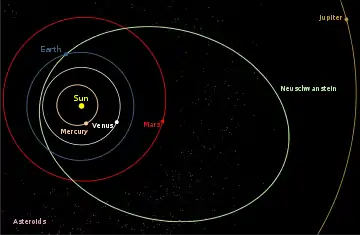 Records of the European Fireball Network allowed reconstruction of the orbit of the meteoroids Neuschwanstein (European Network name: EN060402) around the Sun. The reconstructed orbit was very close to that of Pribram (EN070459) which fell on 7 April 1959 in the former Czechoslovakia, and thus both meteorites could originate from the same parent body. Pribram is an ordinary chondrite (type H5). Isotope analysis resulted in the age of 48 million years for Neuschwanstein and 12 million years for Pribram,[7] and thus the common parent body would have to be heterogeneous. It could be a "rubble pile" which was held together only by gravitational force and was shattered by a collision with another body.[2][3][8][9][10]
