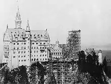 In 1868, the ruins of the medieval twin castles were completely demolished; the remains of the old keep were blown up.[25] The foundation stone for the palace was laid on 5 September 1869; in 1872 its cellar was completed and in 1876, everything up to the first floor, the gatehouse being finished first. At the end of 1882 it was completed and fully furnished, allowing Ludwig to take provisional lodgings there and observe the ongoing construction work.[24] In 1874, management of the civil works passed from Eduard Riedel to Georg von Dollmann.[26] The topping out ceremony for the Palas was in 1880, and in 1884, the King was able to move in to the new building. In the same year, the direction of the project passed to Julius Hofmann, after Dollmann had fallen from the King's favour.
