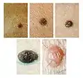 Nevi are typically diagnosed clinically with the naked eye or using dermatoscopy. More advanced imaging tests are available for distinguishing melanocytic nevi from melanoma, including computerized dermoscopy and image analysis.[14] The management of nevi depends on the type of nevus and the degree of diagnostic uncertainty. Some nevi are known to be benign, and may simply be monitored over time. Others may warrant more thorough examination and biopsy for histopathological examination (looking at a sample of skin under a microscope to detect unique cellular features). For example, a clinician may want to determine whether a pigmented nevus is a type of melanocytic nevus, dysplastic nevus, or melanoma as some of these skin lesions pose a risk for malignancy. The ABCDE criteria (asymmetry, border irregularity, color variegation, diameter > 6 mm, and evolution) are often used to distinguish nevi from melanomas in adults, while modified criteria (amelanosis, bleeding or bumps, uniform color, small diameter or de novo, and evolution) can be used when evaluating suspicious lesions in children.[15] In addition to histopathological examination, some lesions may also warrant additional tests to aid in diagnosis, including special stains, immunohistochemistry, and electron microscopy.[16] Typically, the nevi that exist since childhood are harmless.