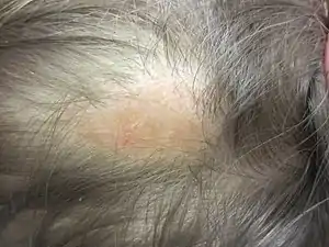 Nevus sebaceus or sebaceous nevus (the first term is its Latin name, the second term is its name in English; also known as an "organoid nevus"[1]:661 and "nevus sebaceus of Jadassohn"[2]:773) is a congenital, hairless plaque that typically occurs on the face or scalp.[3] Such nevi are classified as epidermal nevi and can be present at birth, or early childhood, and affect males and females of all races equally.[4] The condition is named for an overgrowth of sebaceous glands in the area of the nevus.