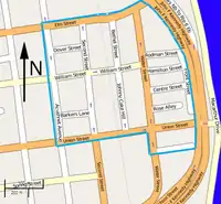 The district is bounded by Front Street on the east, Elm Street on the north, Acushnet Avenue and the Central New Bedford Historic District on the west, and Commercial Street on the south. This area includes 11 city blocks and part of a twelfth. On these 19.6 acres (7.9 ha) are 20 buildings, mostly historic but with some modern intrusions, mainly parking lots, a gas station and newer additions to the New Bedford Whaling Museum. Cobblestone paving and gas lamps have been added since the historic district was designated, in order to recreate the neighborhood's 19th-century appearance.[1] The majority of the buildings are commercial in design and use, but there are some houses, and some mixed-use structures.[1][4]