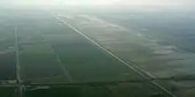 Towards the northern end of the washes, the New Bedford River is joined by the River Delph at Welmore Lake Sluice. The origins of this channel, which is sometimes called the thirty-foot drain, are obscure, although it was built to assist the removal of water from the washlands, according to C. N. Cole writing in 1784. Prior to 1825, there was a dam where the sluice is located, and water was let out of the washland by cutting a slot in it, which the flood water enlarged as it passed through. The cost of rebuilding the dam at the end of the process was considerable, and this unsatisfactory arrangement was replaced by a sluice. At the same time, the New Bedford River was made wider and deeper, while some of the flood banks were also raised.[4] At its southern end, the River Delph is connected to the Old Bedford River at a double bend near Welches Dam. The northern half of the Old Bedford River is no longer connected to its southern half. It is not known exactly when this configuration was built, although it may have been between 1789 and 1821, since Cole's map of 1789 shows the Old Bedford River proceeding in a straight line, and Baker's map of 1821 shows two rivers, each with a double bend.[5] Blair argues for a date soon after the New Bedford River was built, however, since Welches Dam is named after Edmund Welche, who worked with Vermuyden, and the dam in question was originally built across the Old Bedford River.[6]