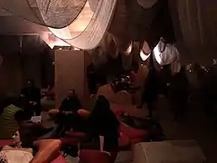 The installation began on the main floor where didactic texts described different cycles of time and the nature of sleep.[3] There were three additional zones in the lower level: the Transitory zone, the Dark zone, and Oneroi.[1] The Transitory zone was a 72-ft long hallway[2] where visitors had to take off their shoes and store their belongings before entering the cave.[6] This zone was lit from above by artificial skylights created by lighting designer Conor Sampson.[2] Here visitors could make use of "spelunking gear"[7] - unusually shaped red, yellow, and purple pillows designed by Natalie Fizer and Emily Stevenson from Pillow Culture.[3] Passing through a felt curtain,[8] the main cave/Dark zone was scattered with large felted loungers meant to evoke rock-like formations.[6] The area was dimly lit and covered in over 6,000 yards of felt[6] meant to dampen sound.[8] The loungers included built-in speakers that emitted soft humming and wave-like noises created by an assistant professor at the Daniels Faculty, Mitchell Akiyama.[6] The third zone, Oneroi, was created by U of T Daniels Assistant Professor Petros Babasikas and artist Chrissou Voulgari.[6] Oneroi consisted of more secluded, curtained areas in the upper mezzanine of the cave where visitors could either create an audio recording of their dreams or listen to previously recorded dreams of others.[6]