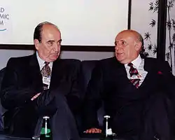 On 2 September 2009 Karamanlis announced his intention to call an election, although one was not required until September 2011.[15] The parliament was dissolved on 9 September, and the 2009 legislative election was held on 4 October. New Democracy's share of the parliamentary vote dropped to 33.47% (down by 8.37%) and they won only 91 of 300 seats, dropping by 61 since the last election.[16] The rival PASOK soared to 43.92% (up 5.82%), and took 160 seats (up 58).[16] The 33.5% tally marked a historic low for the party since its founding in 1974.[17] Karamanlis conceded defeat and stated that he would resign as a leader of New Democracy, and would not stand as a candidate at the next party election.[18] Two former Ministers for Foreign Affairs, Dora Bakoyannis and Antonis Samaras, as well as Thessaloniki Prefect Panagiotis Psomiadis were announced as candidates,[19] with Samaras being the favorite to win.[20]