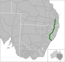 The New England Highway is an 878-kilometre (546 mi) long[1] highway in Australia running from Hexham at Newcastle, New South Wales at its southern end to Yarraman, north of Toowoomba, Queensland at its northern end. It is part of Australia's National Highway system, and forms part of the inland route between Brisbane and Sydney.[2]