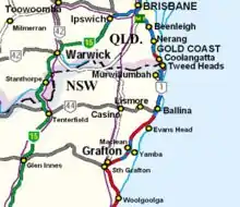 From Brisbane, National Highway 15 (green) follows the Cunningham Highway until Warwick where it then follows southwards, the New England Highway ...