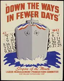 The New England Shipbuilding Corporation was a shipyard located in the city of South Portland, Maine, United States. The yard originated as two separate entities, the Todd-Bath Iron Shipbuilding Corporation and the South Portland Shipbuilding Corporation, which were created in 1940 and 1941 respectively, in order to meet the demand created by World War II. The two merged in 1943, then continued to produce ships as the New England Shipbuilding Corporation's East Yard and West Yard. New England Shipbuilding ranked 97th among United States corporations in the value of World War II military production contracts.[1] Both closed at the end of the war.[2][3]