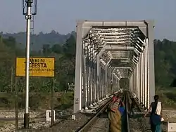 The Dooars or the Himalayan foothills cover a stretch of about 140 km in the northern part of Jalpaiguri district between the Teesta and Sankosh rivers with fields, forests and tea gardens in the backdrop of low hills. Numerous mountain streams criss-cross the region. The Dooars are particularly notable for its forests and wild life sanctuaries – Gorumara National Park, Jaldapara National Park, Chapramari Wildlife Sanctuary, Chilapata Forests, and Buxa Tiger Reserve. The New Jalpaiguri–Alipurduar–Samuktala Road line runs through the area.[8] It also runs through another sanctuary outside the Dooars – Mahananda Wildlife Sanctuary.