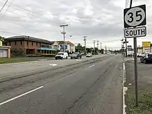 Route 35 begins at the entrance to Island Beach State Park in Berkeley Township, Ocean County on the Barnegat Peninsula. It heads north on a divided highway with parking spaces in the median through residential areas of South Seaside Park.[2] It briefly becomes an undivided highway before crossing into Seaside Park, where the route becomes four-lane, divided Central Avenue, which also has median parking spaces. Route 35 passes by residences in Seaside Park, with the median widening for the Seaside Park Police Department building at the Sixth Avenue intersection, and then the road widening to six lanes further north.[1][2] Upon crossing Decatur Street, the southbound lanes of Route 35 run one block to the west of the northbound lanes and then turns to the west, crossing into Seaside Heights, a beach resort that has a boardwalk and two amusement piers, Casino Pier and Funtown Pier. In Seaside Heights, Route 35 turns north and has an interchange with the eastern terminus of Route 37 on the Seaside Heights/Berkeley Township border on the eastern shore of Barnegat Bay. At this interchange, a ramp provides access from northbound Route 35 a short distance past the ramp from eastbound Route 37 to Seaside Heights, connecting to Sumner Avenue.[1][3]