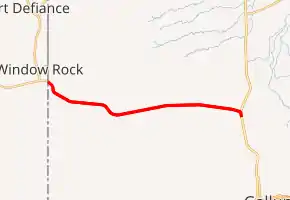 NM 264 begins at the Arizona–New Mexico state line just northwest of the unincorporated village of Tse Bonito. The highway continues west as AZ 264 into Window Rock, the capital of the Navajo Nation. NM 264 begins within the main body of the Navajo Nation but heads southeast out of the Native American reservation and passes through Tse Bonito. The highway is four lanes, either divided or with a center turn lane, for its entire length, and it passes through an area of checkerboard land ownership in which alternating sections of land have Navajo and non-Navajo ownership. NM 264 passes to the north of Rock Springs, and the route passes through the village of Yah-ta-hey immediately before it reaches its eastern terminus at a trumpet interchange with US 491. The interchange primarily serves the movement between NM 264 and US 491 south toward Gallup, although the U.S. Highway is entirely four lanes from Gallup north to Shiprock.[2]