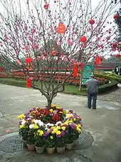 In Cantonese, the new year tree is called Nin Fa (Chinese: 年花, literally New Year Flower). Bamboo is just one of the new year trees for the Cantonese, the others being mandarin and peach. The mandarin plant is called Kat (Chinese: 桔), which is a homophone to Chinese: 吉, standing for good luck. The peach flower stands for good relationships; love is one of the relationships, so it's also a wish for love.