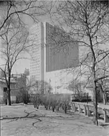 As part of the Coliseum project, Moses condemned the area from West 58th to West 60th Streets on the west side of Columbus Circle.[1] However, the start of construction was delayed by a lawsuit from a taxpayer who wanted an injunction on the acquisition.[31] The Grand Central Palace held its last show in late 1953, and due to the delays in building the Coliseum, it was anticipated that New York City would not have a convention space for the following three years.[32] An appeals court gave the city the right to acquire the land for the project in October 1953,[33] and the city obtained the land in November of that year.[34] The Coliseum project, as well as the related development of housing, was approved in December 1953.[35] It replaced the Gotham National Bank Building[36] as well as smaller tenement and retail buildings.[1] In the original plan, there would have been a separate office building and convention center, but the two structures were combined in a late revision to the plan.[37] There would also be a 900-space parking lot under the Coliseum.[38]