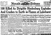 ![]() New York Herald Tribune cover on May 7, 1937 covering the Hindenburg disaster | |