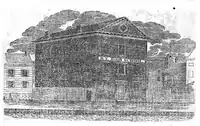 The boys' building was sold to the Society of Mechanics and Tradesmen, which moved its headquarters and school on Chambers Street to the new location.[2] During a cholera outbreak in 1832, the building was used as a hospital.[7][8] In 1845, the Society purchased an adjoining narrow lot fronting Broadway, upon which it built the entrance corridor of what became Mechanic's Hall, a popular home for minstrel performances, with the former high school lot serving as the performance space. The Society held onto the original high school property and Broadway-linking plot until 1945.[9]