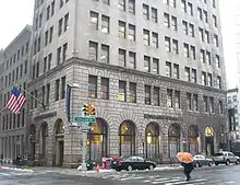 When New York Law School reopened in 1919, it was located in another building at 215 West 23rd Street, in Midtown.[10] However, George Chase contracted an illness that resulted in him running New York Law School for the last three years of his life from his bed; he died in 1924.[11] New York Law School continued without Chase, seeing its enrollment peak in the mid-1920s, but it saw a steady decline after that. At the onset of the Great Depression, the law school began seeing a serious decline in enrollment, which forced the law school to accept a much lower quality of students than they had previously accepted. With much fewer and poorer performing students, the law school moved to smaller facilities at 253 Broadway, just opposite City Hall.[12] In 1936, the law school moved to another location at 63 Park Row, on the opposite side of City Hall Park; it also became coeducational that same year. However, as enrollment was still declining, both because of the Great Depression and because of the military draft started in 1940, and the school closed in 1941. The remaining students that were still enrolled finished their studies at St. John's University School of Law, in Brooklyn.[13]