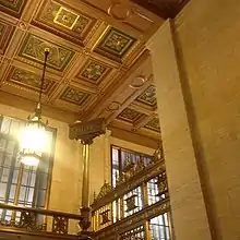 Inside the New York Life Building is a large lobby running west–east for 400 feet (120 m), the entire length of the building. The lobby is designed similar to the nave of a cathedral,[9][23] with travertine walls, a painted coffer ceiling with barrel vaults 38 feet (12 m) tall, as well as bronze ornamental grilles on doorways and elevators.[13] Perpendicular to the lobby are a pair of passages running north and south to 27th and 26th Streets respectively, providing six entrances from the surrounding streets.[9][13]