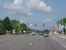 Work began in the 1940s on new super two alignments for US 104 in Wayne, Cayuga, and Oswego counties. The new highway was built on a routing parallel to that of Ridge Road and served as a bypass of the communities along Ridge Road. The first portion of the super two, extending from the Monroe–Wayne county line at Union Hill to west of Sodus, was built in the mid-1940s and completed by 1947.[34][35] An extension of the highway around Sodus to NY 414 in Huron was constructed in the mid-1960s and opened by 1968. In between the end of the super two and Ridge Road, US 104 was routed on Lake Bluff Road.[36][37] The remainder of the super two between Huron and Red Creek was finished by 1974.[38] East of the super two, a bypass was constructed around the village of Hannibal during the early 1960s and opened to traffic by 1964.[36][39]