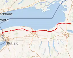 New York State Route 104 (NY 104) is a 182.41-mile-long (293.56 km) east–west state highway in Upstate New York in the United States. It spans six counties and enters the vicinity of four cities—Niagara Falls, Lockport, Rochester, and Oswego—as it follows a routing largely parallel to the southern shoreline of Lake Ontario, along a ridge of the old shoreline of Glacial Lake Iroquois.[3] The western terminus of NY 104 is an intersection with NY 384 in Niagara Falls, Niagara County, while its eastern terminus is a junction with NY 13 in the town of Williamstown, Oswego County. The portion of NY 104 between Rochester and the village of Webster east of the city is a limited-access highway known as the Keeler Street Expressway west of NY 590 and the Irondequoit–Wayne County Expressway east of NY 590; from Williamson to Oswego, NY 104 is a super two highway.