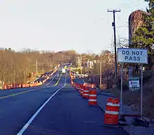 Modern NY 17K follows the easternmost part of the Newburgh and Cochecton Turnpike, a 19th-century toll road that extended from the Delaware River at Cochecton to the Hudson River at Newburgh. The turnpike was opened in 1810 and dissolved in 1872 following the establishment of the nearby Middletown and Crawford Railroad one year earlier. Stone markers indicating the distance from Newburgh can still be seen by the roadside at several locations.[13][14] In the early 20th century, the state of New York took over the turnpike's former routing from Fosterdale east to Newburgh to rebuild the highway as a toll-free state road.[15] The segment from Bloomingburg to Newburgh was added to the state highway system in stages, beginning on September 9, 1902, with the section between Montgomery and what is now the New York State Thruway overpass near Newburgh.[16] The Bloomingburg–Newburgh state highway was entirely state-maintained by 1926.[15]