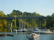 The Army Corps of Engineers expanded navigation of Eighteen Mile Creek to Burt in February 1972 thanks to bridge construction.[51] However, despite the new bridge, the history of bridges at Olcott caused problems for boaters. Despite the old bridge being torn out, the pilings of the 1878 structure were still present 2–3 feet (0.61–0.91 m) underwater.[52]