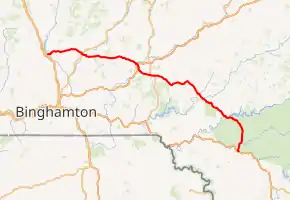 New York State Route 206 (NY 206) is a 74.57-mile-long (120.01 km) state highway in the Southern Tier of New York in the United States. It runs through some lightly populated regions along the state's southern border, from Central New York to the Catskills. It begins near a busy intersection with Interstate 81 (I-81) at Whitney Point and runs east from there through Greene. The eastern terminus is located at a junction with NY 17 (future I-86) at Roscoe in Sullivan County. It is one of the longest three-digit routes in New York, and the only long one not associated with a two-digit route or a former U.S. Route. Yet due to its location it sees little traffic, although for much of its length it follows the route of a main 19th century thoroughfare, the Catskill Turnpike. It is primarily a long shortcut around Binghamton.