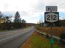 New York State Route 212 (NY 212) is an east–west state highway located entirely within Ulster County, New York, in the United States. It runs for 21.92 miles (35.28 km) from an intersection with NY 28 in the interior of the Catskill Park to a junction with U.S. Route 9W (US 9W) and NY 32 on the west bank of the Hudson River, providing a key interchange with the New York State Thruway (Interstate 87 or I-87) along the way. The mostly rural two-lane route serves the communities of Woodstock and Saugerties while passing Cooper Lake, Kingston's reservoir. NY 212 was assigned as part of the 1930 renumbering of state highways in New York.