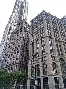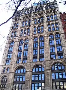 41 Park Row was originally designed by George B. Post and constructed between 1888 and 1889 in the Romanesque Revival style.[2][10] The structure was originally composed of 13 stories, including a mezzanine above the 12th floor as well as a mansard roof covering the top floors.[11][10]Robert Maynicke, a onetime associate of Post's,[12] designed its four-story expansion in 1904–1905.[2][10] During the expansion, the mezzanine was converted to a full 13th story and three more stories were added.[12][13] Following the expansion, 41 Park Row was 212 feet (65 m) tall with 16 stories.[6] The building is the last remaining former newspaper headquarters on Printing House Square.[6][14]