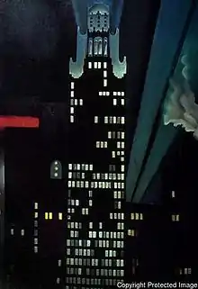 Georgia O'Keeffe created a series of paintings of New York skyscrapers between 1925 and 1929. They were made after O'Keeffe moved with her new husband into an apartment on the 30th floor of the Shelton Hotel, which gave her expansive views of all but the west side of the city. She expressed her appreciation of the city's early skyscrapers that were built by the end of the 1920s. One of her most notable works, which demonstrates her skill at depicting the buildings in the Precisionist style, is the Radiator Building—Night, New York, of the American Radiator Building.