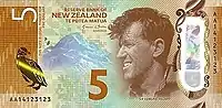 The New Zealand five-dollar note is a New Zealand banknote. It is issued by the Reserve Bank of New Zealand and since 1999 has been a polymer banknote. It was first issued on 10 July 1967 when New Zealand decimalised its currency, changing from the New Zealand pound to the New Zealand dollar. The note originally had an image of Queen Elizabeth II on the front; since 1992 it has had an image of Sir Edmund Hillary.[1][2] The new design released in October 2015 was named "Banknote of the Year" by the International Bank Note Society for 2015.[3]