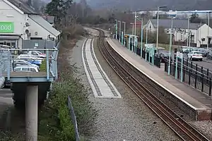 Newbridge railway station (Welsh: Trecelyn) is on the Ebbw Valley Railway and serves the towns of Newbridge and Blackwood in south east Wales. The current station is on the site of the former station and coal yard in the town centre opposite the Co-op food store and existing council car park. The single-platform station and car park is off a signalised junction on Bridge Street.