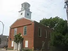 According to a number of historical sources, Newburgh was a prominent stop on the Underground Railroad between the mouth of the Little Pigeon River and Lake Michigan.[11] On July 18, 1862, Newburgh was the first town north of the Mason-Dixon line to be captured by the Confederate forces during the American Civil War in what would come to be known as the Newburgh Raid. Colonel Adam "Stovepipe" Johnson, with a partisan band, crossed the Ohio River and confiscated supplies and ammunition without a shot being fired.[12] The Confederates would have been unable to shell the city (as promised) had Newburgh put up a fight. The Confederates' "cannons" were an assemblage of a stove pipe, a charred log, and wagon wheels. The raid convinced the federal government that it was necessary to supply Indiana with a permanent force of regular Union Army soldiers to counter future raids.[13] Many of the structures used in this raid are still standing, including The Exchange Hotel.