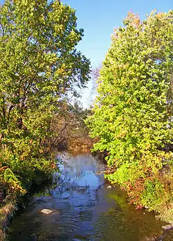 Since Orange Lake is nearly 600 feet above sea level, its outlet stream (sometimes called Bushfield Creek) powered many varied mills as it wound its way to the Hudson River, including a saw mill, grist mill and coinage mill right at the outlet from the lake, all owned by Thomas Machin. A flour mill stood where the stream now travels beneath Route 300. In a different part of town, the Gidney family operated a grist mill on Gidneytown Creek. Today, the site of the Gidney Mill is owned by the town, and the old brick chimney from the mill remains standing and is marked by an historic site marker. The animal control center for the town is also located on this property. The old gunpowder mills in what is now Algonquin Park today serve as the focal point of the only historic district in the town. For many years, there was a bleachery owned by the Chadwick Family.[15]