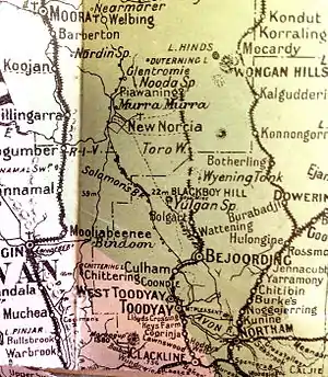 The Newcastle–Bolgart Railway was the second stage of the Clackline–Miling railway. It was opened on 6 December 1909 by the Western Australian Premier Newton Moore. The line ran between Newcastle (now Toodyay) and Bolgart, Western Australia.[1] The line came about after community support rallied against the Government, who were seen as not approving the rail to reduce the value of the Midland Railway Company land holdings. At a meeting on 6 November 1906 local MLA Timothy Quinlan then Speaker of the Western Australian Legislative Assembly threatened to resign from the government and join the opposition. The meeting proposed that Quinlan should meet with Moore and obtain a definitive answer as to whether he would include the line on the schedule of proposed railways.[2]