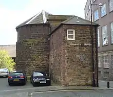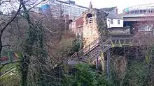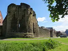 Large amounts of the wall were demolished during the 18th and 19th centuries; the most substantial remains are on the western side of the city. The longest continuous section runs the length of Back Stowell Street, in the Chinatown area. It includes three towers: Herber Tower, Morden Tower and Ever Tower; since 1964, Morden Tower has been used as a venue for poetry readings.[16] At the northern end of this section, the wall has been cut through by St Andrew's Street, with fragmentary remains in St Andrew's churchyard, opposite; at the southern end, Stowell Street cuts through onto Bath Lane. The outer ditch has been recreated along this part of the wall.[17] From Stowell Street, a complete section of wall, which includes Durham Tower, stretches southeast along Bath Lane, ending close to Westgate Road. The walls between Westgate Road and St Andrew's Street are known as the West Walls. Near the river, a partially demolished section of wall is visible on the steep bank between Hanover Street and Close which, between the 1840s and the 1980s, was covered by warehouses.[18] Another substantial portion of the wall stands north of Hanover Street, adjacent to Orchard Street, and the excavated foundations of Gunner Tower can be seen in Pink Lane. On the eastern side of the city stand three towers: Plummer Tower in Croft Street, Corner Tower at the junction of City Road and Melbourne Street, and Sallyport Tower in Tower Street. Plummer Tower was modified by the Company of Cutlers in the 17th century, and the Company of Masons, who added an upper storey and a new western facade, in the 18th century.[19] Sallyport Tower was altered by the addition of a banqueting hall on the first floor in 1716 which was used by the Shipwrights' Company.[20] The walls are a Scheduled Ancient Monument.[21]