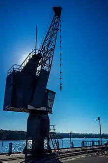 1) The "Original Establishment Precinct" is in the north west corner of the site facing Parramatta River and contains the earliest military buildings and evidence of its occupation as an Armament Depot from 1897. It contains the wharf with two cranes, reclaimed land and part of the light rail system as well as Federation face brick buildings which were purpose built to store and distribute armaments. These buildings are protected by earth mounding and concrete separation blast walls to shield explosive materials in event of accidents. At the top of the precinct on a hill at the end of a cobble stone driveway flanked by two rows of trees ending in two sandstone gate posts are administration and residential buildings. These buildings are a mixture of Federation brick buildings constructed in the first phase and other buildings built during the 1920s, 1930s and 1940s. The later buildings are a mix of materials including timber and fibro with asbestos roofing. The cranes are dated as c. 1973.[1]