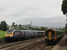 In more recent times, a collision occurred on 25 March 1994 when a Class 158 DMU, working a Paignton to Cardiff service, ran into the back of a Class 43 standing in the platform with a Penzance to Edinburgh train.[10] Thirty-one people were injured.[11] Then in March 1997 a similar train from London was derailed by a bearing failure as it approached the station.[12]