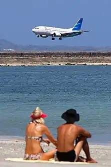The Pelabuhan Udara Tuban, or Tuban airfield, was established in 1931 at the narrowest point on the southern coast of Bali. The airport was originally built as a simple 700 m long airstrip by the Dutch Colonial administration's Voor Verkeer en Waterstaats public works office.[5] When first established the site only had a few huts and a short grass runway. The northern end lay in the Tuban village graveyard and in the south it occupied previously vacant land. The location in this area of the island has subsequently facilitated arrivals and departures over the ocean with minimal noise and overflights intruding upon populated areas. The current airport has an east–west aligned runway and associated taxiway, with over 1,000 m of that runway's length projecting westward into the sea.