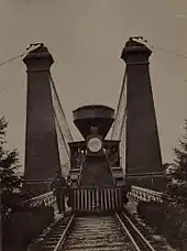 Roebling first signed on as a surveyor for the Beaver River canal system, launching his career with a string of canal and railroad projects.[42] Aside from writing articles in engineering journals, Roebling designed his own wire cables[43] and started his own company to manufacture them; the John A. Roebling Company was the first wire rope manufacturer in the United States.[44] Gradually gaining fame for his civil engineering,[45] Roebling finally got to build suspension bridges.[43] His first bridge was the Allegheny Suspension Aqueduct in Pittsburgh. The structure, completed in 1845, was the first suspension aqueduct in the world and the first large American suspension bridge that had multiple spans. Furthermore, it was the first suspension structure built with modern cable-spinning techniques—Roebling's own invention.[46] Earlier bridge building techniques involved fabricating the main cables at a factory, transporting them to the bridge site, and then stretching the heavy cables over the gap to erect them over the bridge. Roebling, during his experiments with wire ropes, conceived and patented a new construction method for these main cables. A long line—the traveler rope—formed a loop around two horizontal wheels, one on each side of the gorge. A lightweight wheel, "the traveling wheel," was attached to this line, and a wire threaded around this wheel. Like a belt in a mechanical system, the traveler rope and its wheel moved across the gap as the horizontal wheels turned, pulling the wire along. The traveling wheel effectively hauled two lengths of the same wire (running above and under the traveling wheel) across the gap at a time. The lengths of wire were collected and bound at intervals to form thicker strands, which were later compressed together into the main cables,[47] supporting themselves and later the proportional weight of the bridge as they were formed.[48] The method became the standard for suspension bridge construction, and remained unchanged for many years. In the 20th century, suspension bridges were still built with this pulley winding system, albeit with more sophisticated equipment.[49]