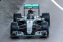 Three-time world champion Niki Lauda began to advise Rosberg.[95] At the Chinese Grand Prix, the season's third round, he took the first pole position of his career and his maiden career victory.[9] He then challenged Red Bull Racing driver Mark Webber for the victory at the Monaco Grand Prix three races later before he settled for a second-place finish.[96] Rosberg had accumulated more championship points than any other driver in the season's previous four races and emerged as an unlikely contender for the Drivers' Championship.[97] Notwithstanding this, he achieved one further top-five finish during the season.[31] However, he struggled to generate temperature into the rear tires on the Mercedes F1 W03 regardless of the climatic conditions, and the car was suited to circuits with slow-speed corners.[98] He was ninth in the Drivers' Championship with 93 points.[31]