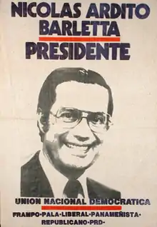 Nicolás Ardito Barletta Vallarino (born 21 August 1938) is a Panamanian politician, served as its President from 11 October 1984 to 28 September 1985, running as the candidate of the Democratic Revolutionary Party (PRD) in the contested elections of 1984.