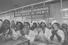 Soon after being freed, he was arrested again and sentenced for "conspiracy against social order", spending the time during the war in prisons and internment camps: Jilava (1940), Caransebeș (1942), Văcărești (1943), and Târgu Jiu (1943).[11] In 1943, he was transferred to Târgu Jiu internment camp, where he shared a cell with Gheorghe Gheorghiu-Dej, becoming his protégé. Enticed with substantial bribes, the camp authorities gave the Communist prisoners much freedom in running their cell block, provided they did not attempt to break out of prison.[12] At Târgu Jiu, Gheorghiu-Dej ran "self-criticism sessions" where various Party members had to confess before the other Party members to misunderstanding the teachings of Marx, Engels, Lenin, and Stalin as interpreted by Gheorghiu-Dej; journalist Edward Behr claimed that Ceaușescu's role in these "self-criticism sessions" was that of the enforcer, the young man allegedly beating those Party members who refused to go with or were insufficiently enthusiastic about the "self-criticism" sessions.[13] These "self-criticism sessions" not only helped to cement Gheorghiu-Dej's control over the Party, but also endeared his protégé Ceaușescu to him.[13] It was Ceaușescu's time at Târgu Jiu that marked the beginning of his rise to power. After World War II, when Romania was beginning to fall under Soviet influence, Ceaușescu served as secretary of the Union of Communist Youth (1944–1945).[10]
